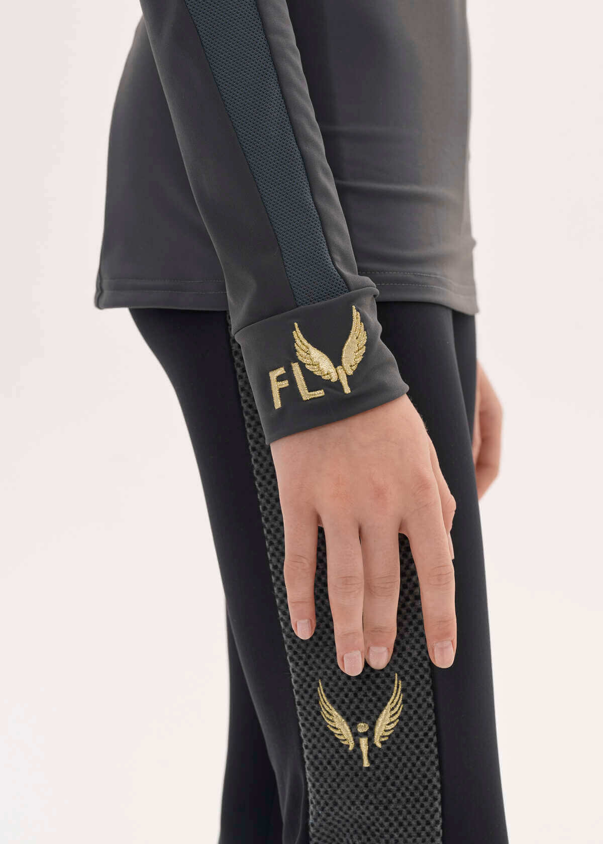 Серый лонгслив со вставкой из сетки на рукавах. Штаны черные с серой вставкой по бокам и вышивкой логотипа. Высокая гигроскопичность и теплоизоляционные качества. Персонализация технически невозможна.
