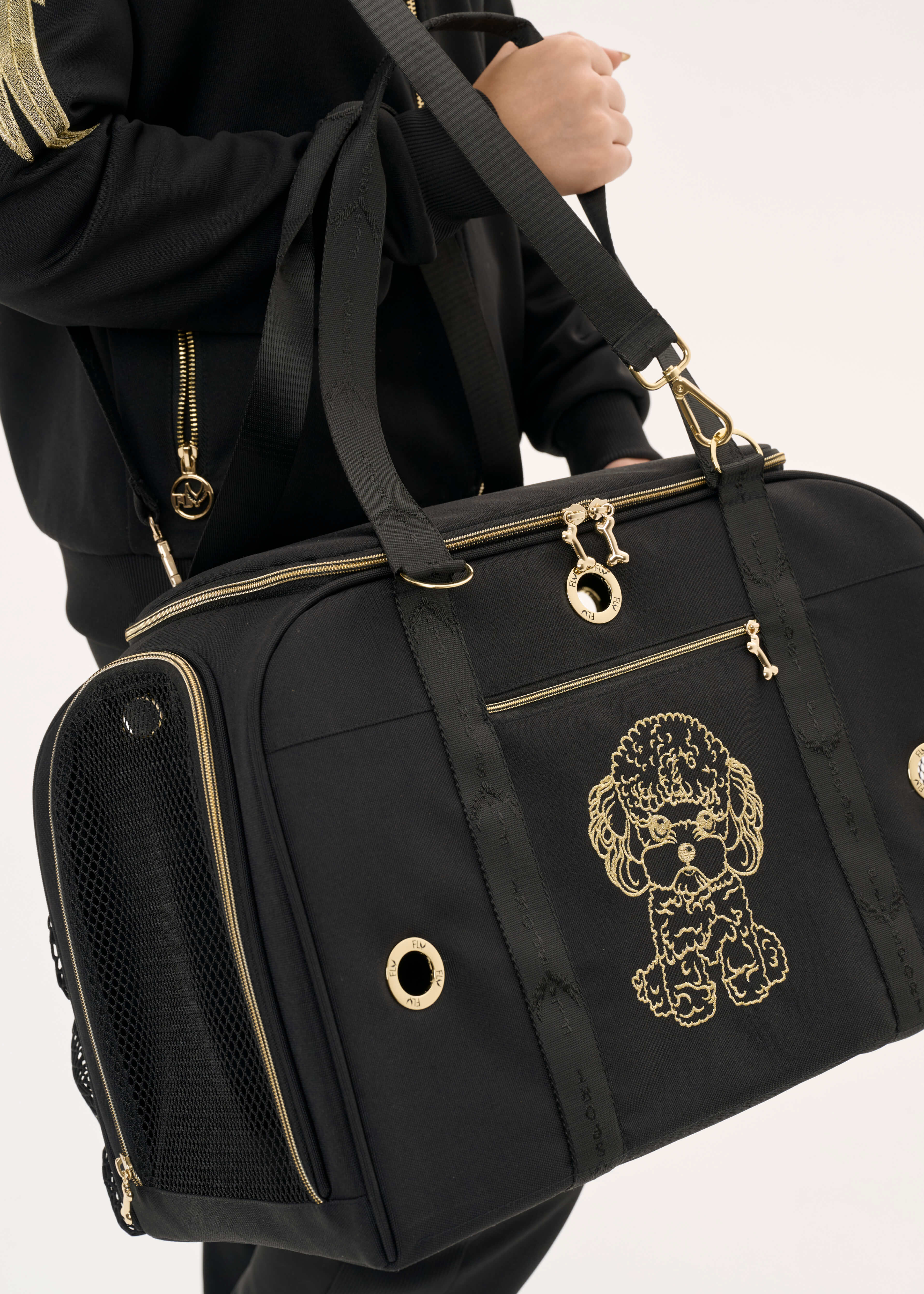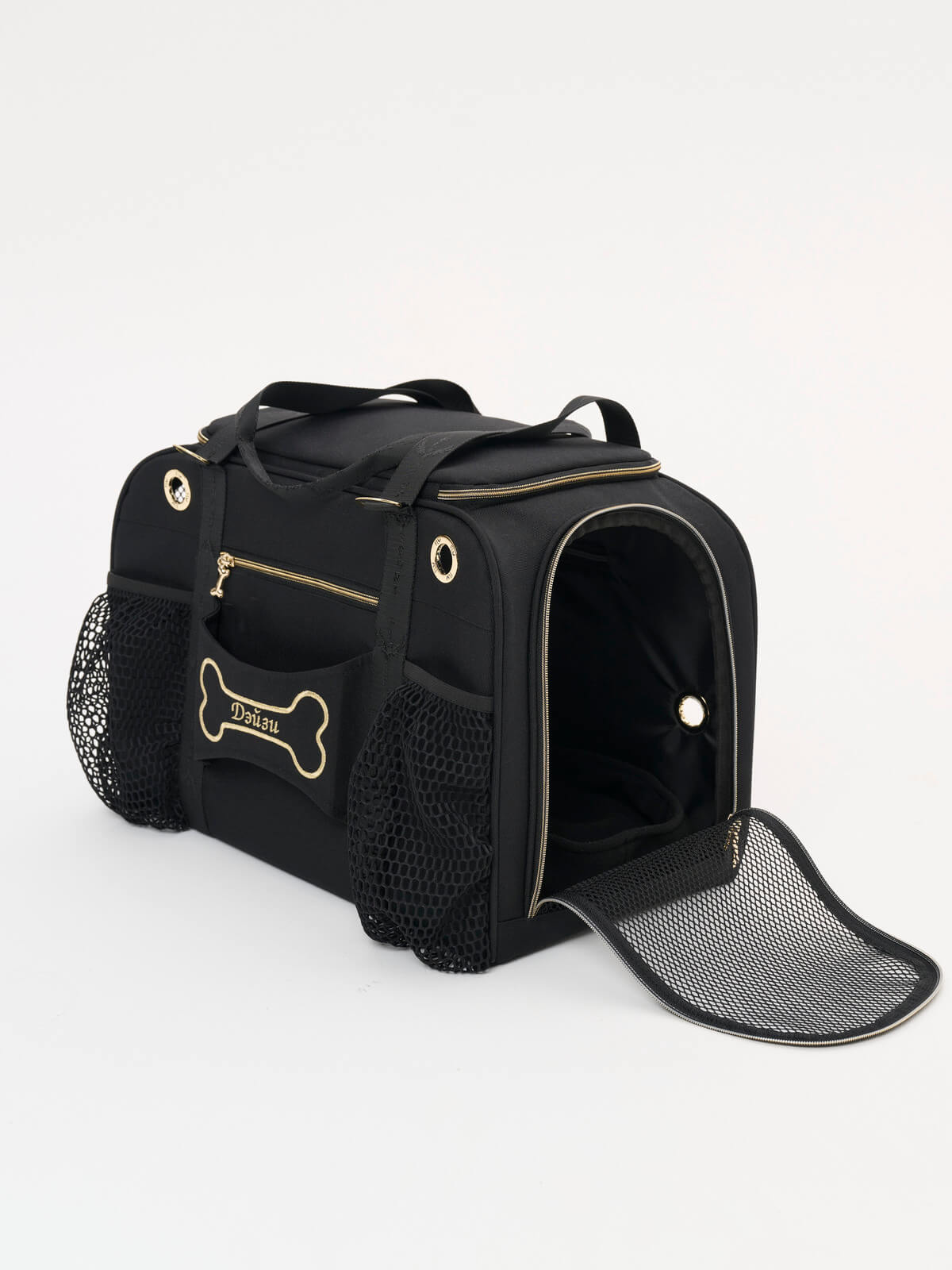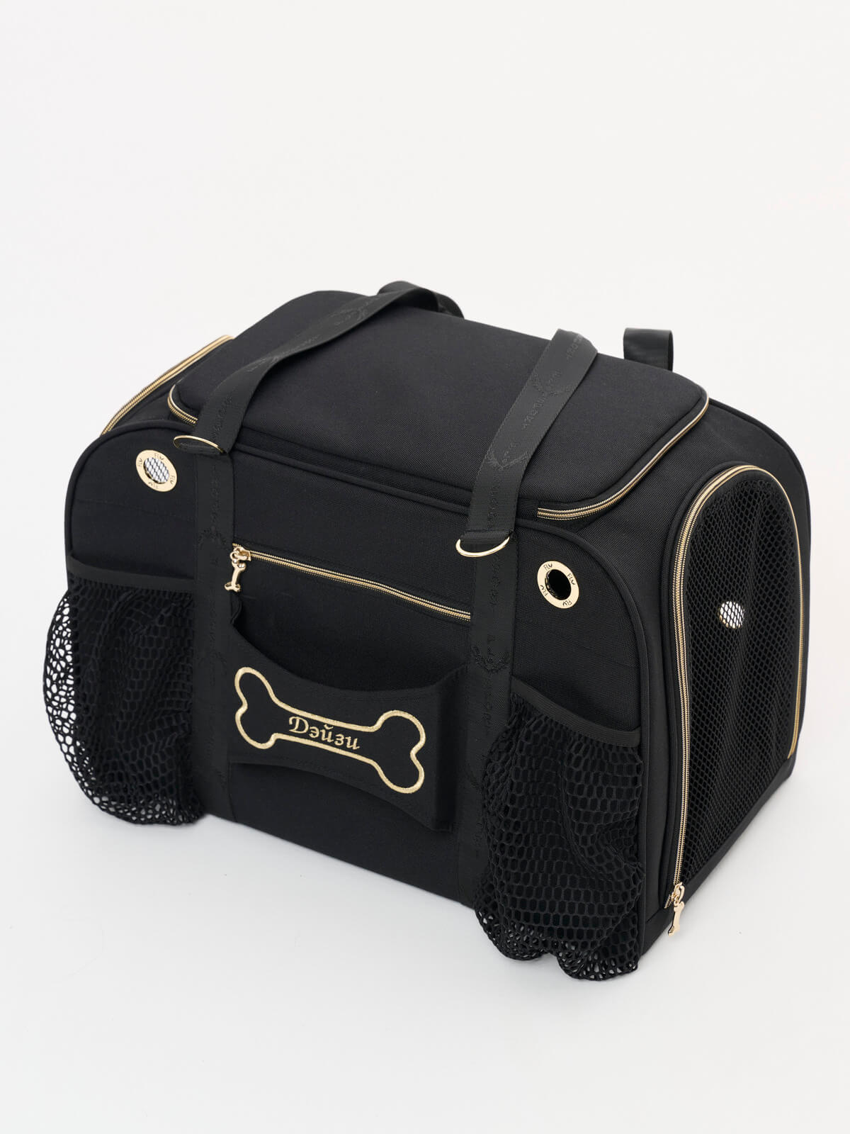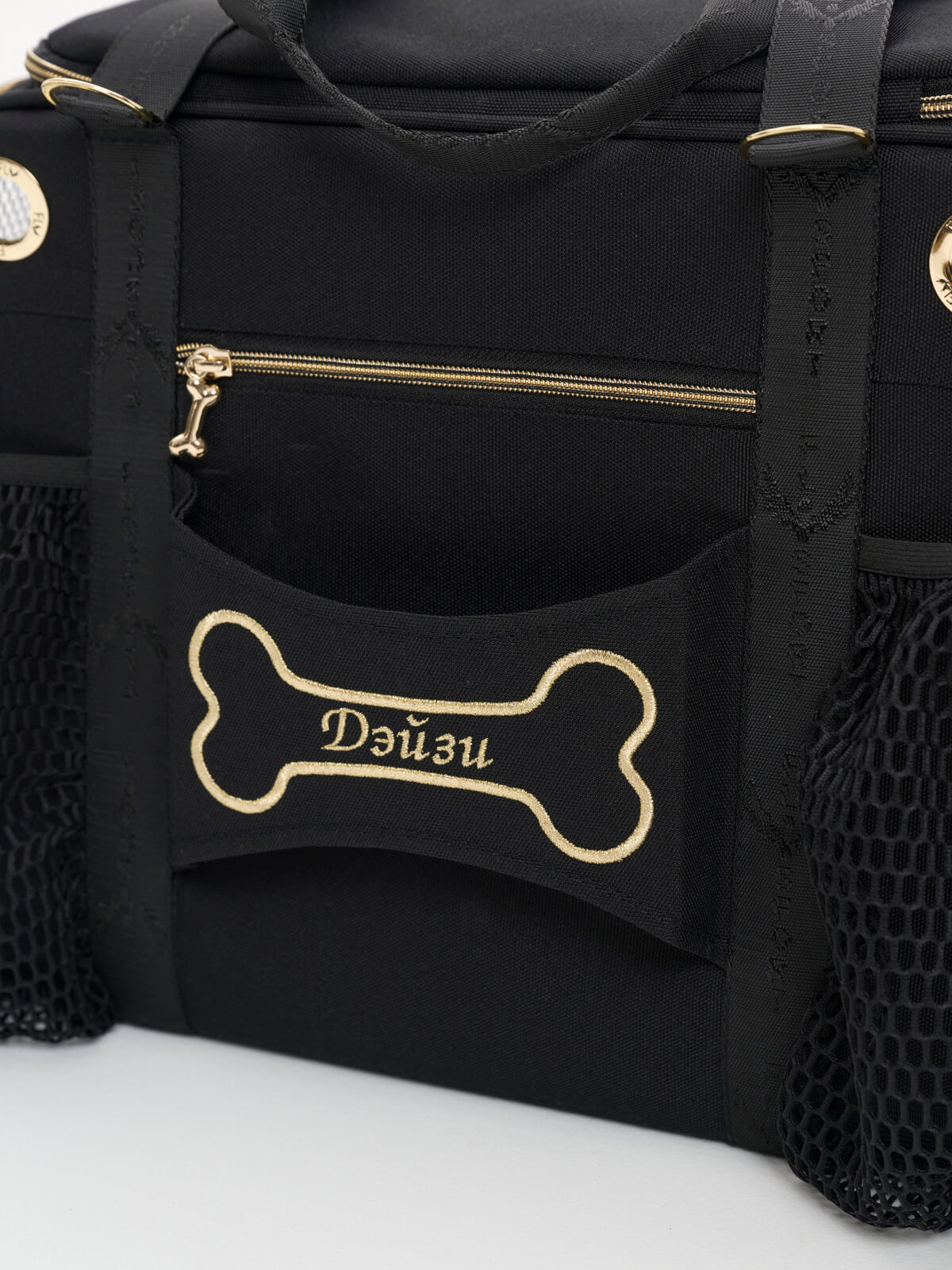 Это не просто комфортный, но и модный аксессуар — ваш питомец точно не останется незамеченным во время прогулок и поездок. Фурнитура изготовлена в виде золотых косточек. Так же можно вышить имя питомца (ограничение по пяльцам - до шести букв!!). Внутри удобные кармашки под пеленки. Сбоку под воду, мисочки. Быстрый доступ, чтобы погладить и успокоить любимое животное.