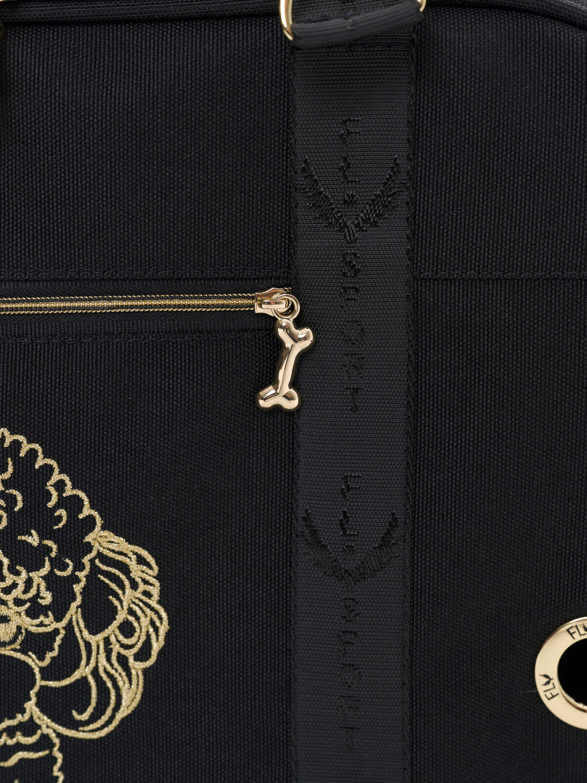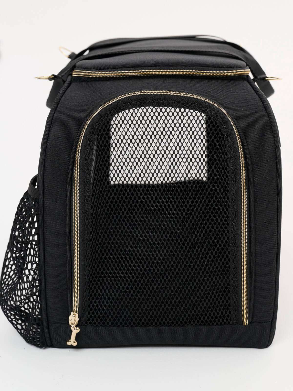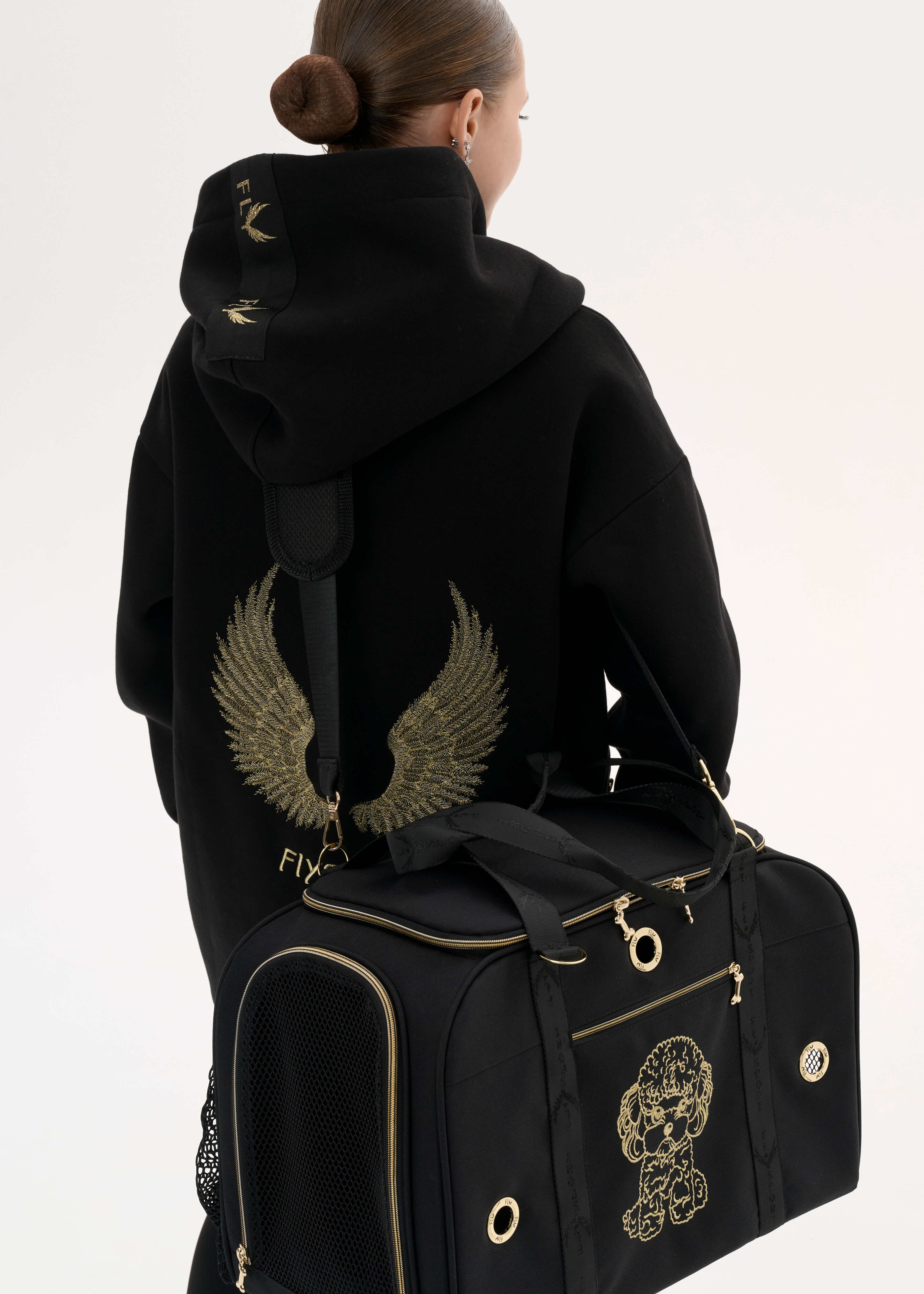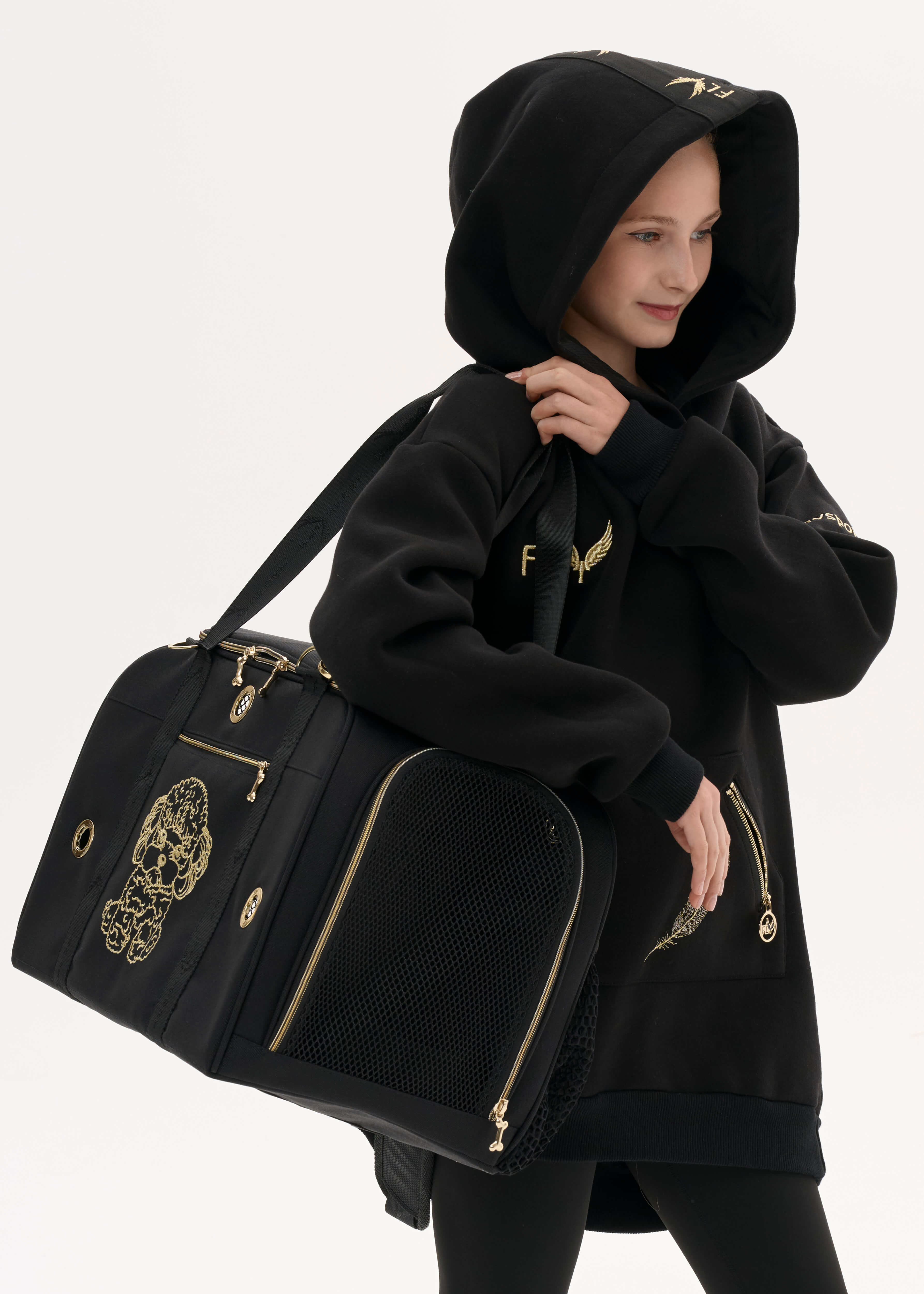 Это не просто комфортный, но и модный аксессуар — ваш питомец точно не останется незамеченным во время прогулок и поездок. Фурнитура изготовлена в виде золотых косточек. Так же можно вышить имя питомца (ограничение по пяльцам - до шести букв!!). Внутри удобные кармашки под пеленки. Сбоку под воду, мисочки. Быстрый доступ, чтобы погладить и успокоить любимое животное.